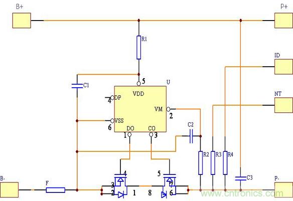 在正常狀態(tài)下電路中N1的“CO”與“DO”腳都輸出高電壓,兩個MOSFET都處于導(dǎo)通狀態(tài),電池可以自由地進(jìn)行充電和放電,由于MOSFET的導(dǎo)通阻抗很小,通常小于30毫歐,因此其導(dǎo)通電阻對電路的性能影響很小。