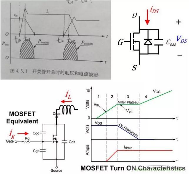 這里就用MOSFET代替BJT了,所以ids = ic,Vds=Vce,Coss也就是Cds代表輸出電容。簡單來說就是當MOS管一開始導通時輸出電容Coss還保持Vds電壓,隨著Ids電流越來越大,Vds電壓終于保持不住,開始下降。直到管子完全開啟。比較詳細的開啟過程是由Miller Plateau造成的,這里借用了網上一些解釋Miller Plateau的圖,如果有不清楚的就請見諒了。