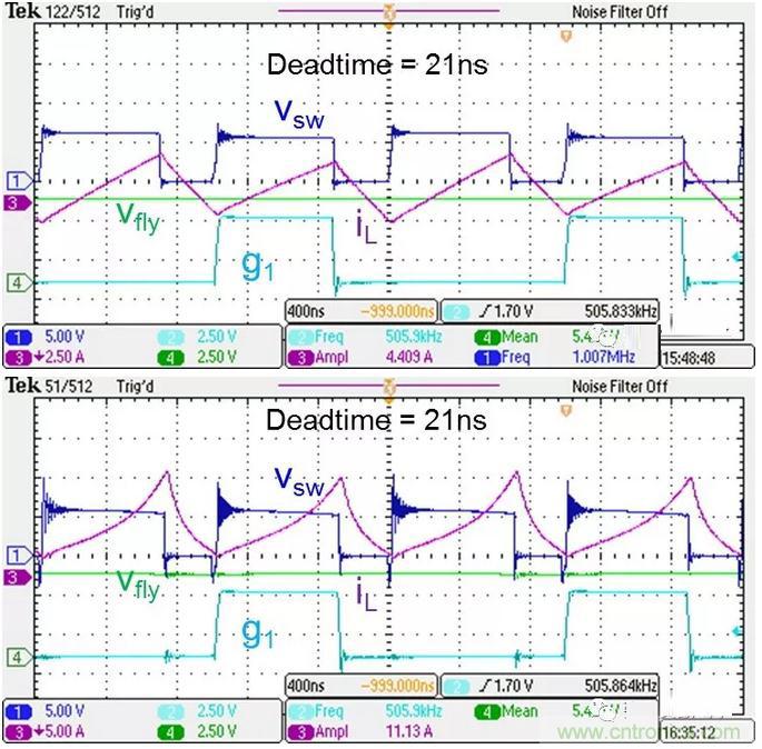對于half bridge 實現ZVS turn on,我們希望當上管Q1開啟時電流是流進switching node (vsw)的,也就是圖中電感電流為負值,當下管Q2開啟時我們希望電流是流出switching node (vsw)的,也就是電感電流為正值。為什么這樣就可以實現ZVS turn on了呢?我們就看上管Q1開啟過程。如果電感電流iL為負,這時候我們先關閉Q2,這時候Q1還未開啟,在這個deadtime中iL會charge Q2的Coss,使Vsw抬高到Vin,當然不能超過Vin,因為Q1的body diode會導通,鉗位住Vsw到Vin,這時候Q1的Vds就是Vin-Vsw=0,這時候我們開啟Q1就實現ZVS了。同理對于Q2開啟時,如果電感電流為正,那么當我們首先關閉Q1管時,Vsw就會被電感電流拉低到0,因為iL》0, Q2的Coss會discharged到0,然后我們再開啟Q2,就可以達到ZVS了。這里我有一張其他Topology的PWM converter的波形圖,也和buck工作原理類似,大概可以看看基本原理,也就是電感電流為負時,Q1可以實現ZVS,讓Vsw的ringing比較小。而當電感電流為正時,實現不了ZVS,Vsw的ringing就比較大了。