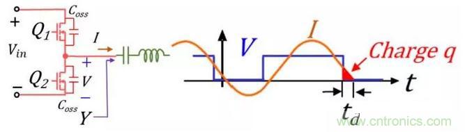 這是因為如果電流I是滯后與電壓V的,這樣在Q1開啟之前電流I為負值就會charge Q2的Coss,同時discharge Q1的Coss,讓V到Vin,這樣Q1就實現ZVS turn on了。Q2開啟之前,電流I為正,也會discharge Q2的Coss,和charge Q1的Coss,讓V到0,這樣Q2就實現ZVS了。