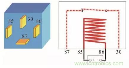 如下圖所示,85#和86#端子是線圈,屬于控制部分;87#和30#端子是觸點,屬于被控制部分(即輸出端)。