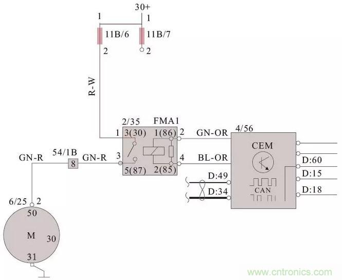 如下圖所示的啟動系統(tǒng)電路中,CEM接收到點火開關模塊的啟動信號后,輸出12V電壓信號給啟動繼電器的2號端子,并控制啟動繼電器的4號端子搭鐵,啟動繼電器電磁線圈通電,繼電器吸合。蓄電池供電通過保險絲進入啟動繼電器的1號端子,在經過其3號端子流出供給起動機,起動機得到供電運轉帶動發(fā)動機啟動。