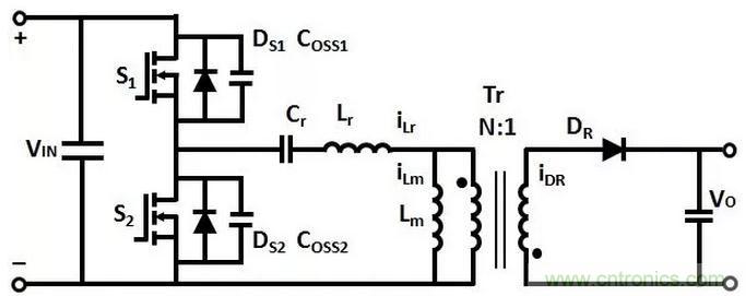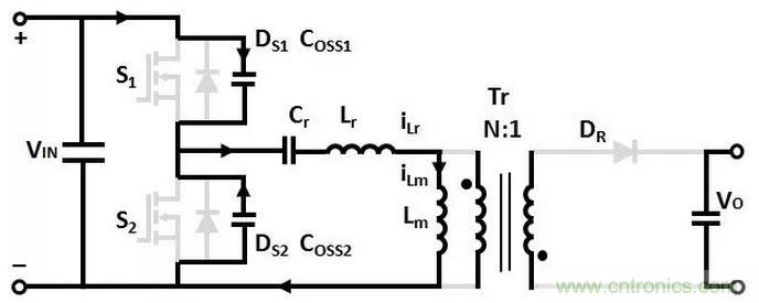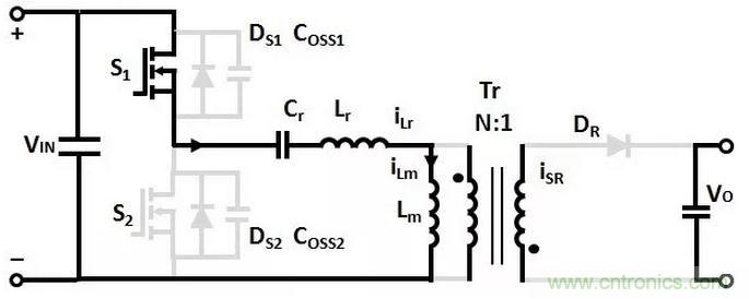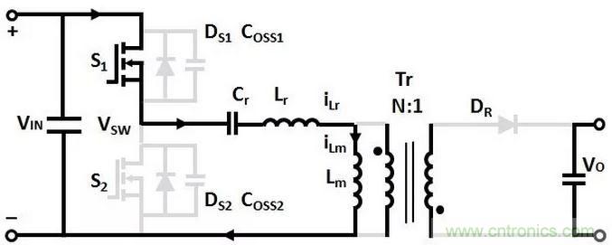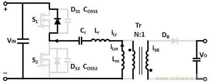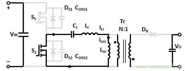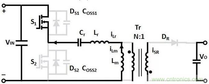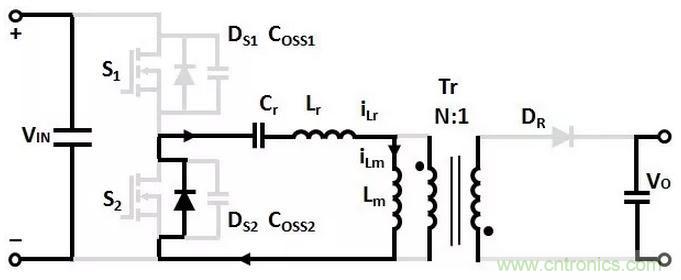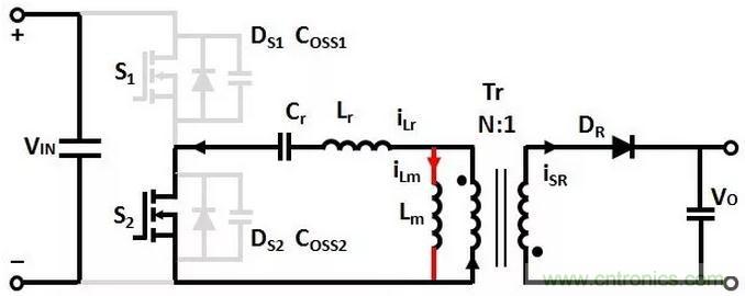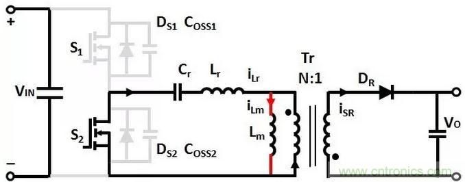 變壓器Lm和Lr的電流從0開始增加,諧振電容Cr充電,沒有能量傳輸到次級的輸出負載。