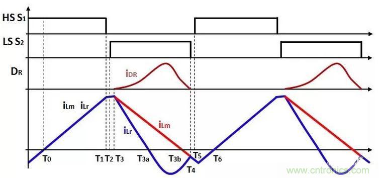 次級繞組的電流減小到0,DR關斷,ZCS關斷,同時,在T4時刻,S2關斷。
