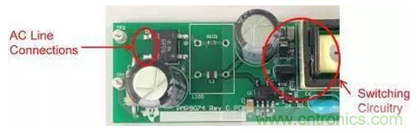 圖1是這些非計劃中電容的一個實例。圖中的右側是一個垂直安裝的FET,所帶的開關節點與鉗位電路延伸至了圖片的頂部。輸入連接從左側進入,到達距漏極連接1cm以內的位置。這就是故障點,在這里FET的開關電壓波形可以繞過EMI濾波器耦合至輸入。