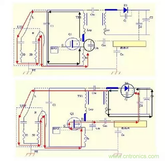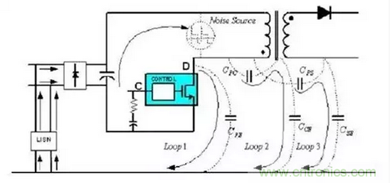 如圖:一般有二種模式:L,N差模成分,以及通過PE地回路的共模成分。有些頻率是差共模均有。