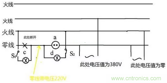 給出草圖當零線斷開時,如過上端負載有未斷開的情況,如圖S2閉合的情況火線與零線通過負載的線圈串聯到了一起,那么零線就是和火線帶一樣的電壓值。你家里的零線如果是從斷點后端接出來的,電壓值如上圖兩種情況380V或者零伏。
