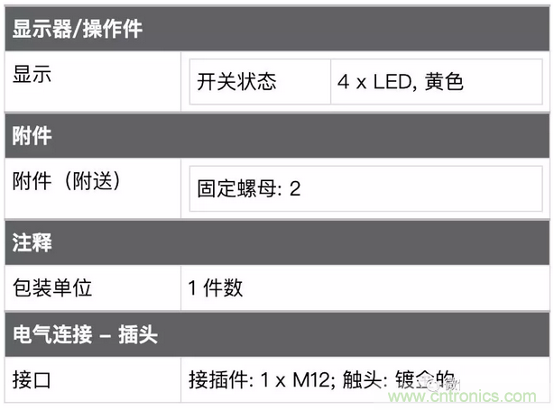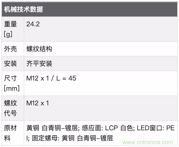 接口:接插件 1xM12 觸頭:鍍金。 這里指這個傳感器是接插型的而不是帶線的傳感器,需要準備M12插頭的線纜,我看到有仿的這款傳感器直接做成有線的...... 可能仿造的人都沒見過正品吧。觸頭鍍金,這個很重要也是一個成本所在,一般接近開關類傳感器接插頭這里使用的鍍銅的居多。我們都知道金有很好的導電性和穩定性,如果產品中使用到了鍍金工藝一般就是為了提高產品的穩定性的,所以可以推斷出這款傳感器應該是從設計到生產制造都是追求穩定性的一個定位的產品。