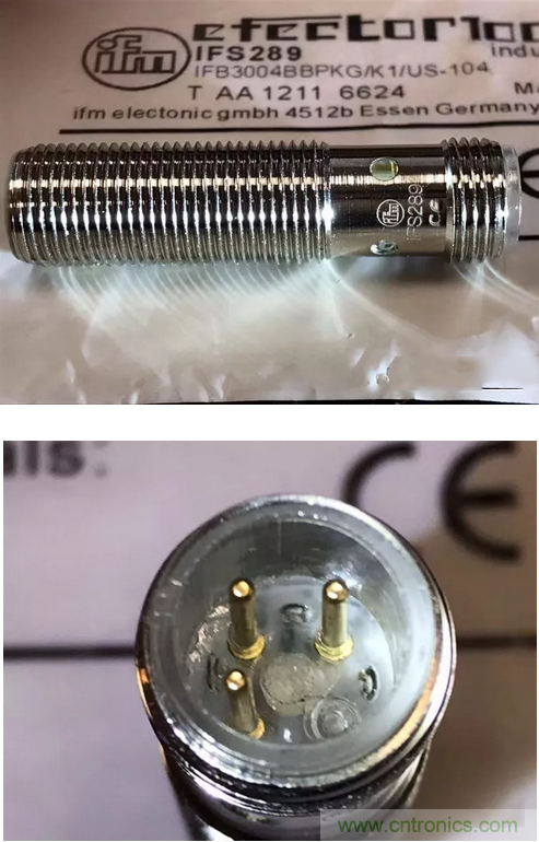 圖二、ifm正品的針腳是鍍金處理的,仿品內套是塑料的針腳是黃銅的。