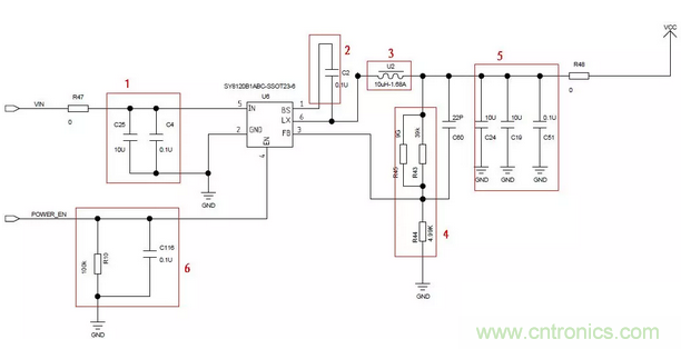 圖中分為6個(gè)部分,按照序號(hào),分別為:輸入電容,自舉電容,電感,反饋電阻,輸出電容,緩啟動(dòng)。