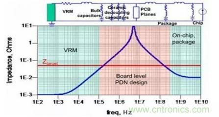 在調試該故障前先回顧下電源噪聲抑制的原理。如下圖所示,電源分配網絡中不同的頻段由不同的元件來抑制噪聲,去耦元件包含電源調整模塊(VRM)、去耦 電容、PCB電源地平面對、器件封裝和芯片。VRM包含電源芯片及外圍的輸出電容,大約作用于DC到低頻段(100K左右),其等效模型是一個電阻和一個 電感組成的二元件模型。去耦電容最好使用多個數量級容值的電容配合使用,充分覆蓋中頻段(數10K到100M左右)。由于布線電感和封裝電感的存在,即時 大量堆砌去耦電容也難以在更高頻起到作用。PCB電源地平面對形成了一個平板電容,也具有去耦作用,大約作用在數十兆。芯片封裝和芯片負責高頻段 (100M以上),目前的高端器件一般會在封裝上增加去耦電容,此時PCB上的去耦范圍可以降低到數十兆甚至幾兆。因此,在電流負載不變的情況下,我們只 要判斷出電壓噪聲出現在哪個頻段,那么針對這個頻段所對應的去耦元件進行優化即可。在兩個去耦元件的相鄰頻段時兩個去耦元件會配合作用,所以在分析去耦元 件臨界點時相鄰頻段的去耦元件也要同時納入考慮。