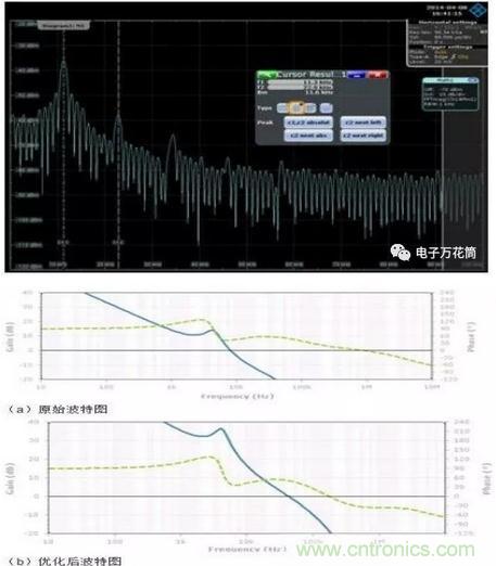 一般來說,11.3KHz應該是VRM的管轄范圍,此處出現較大噪聲說明VRM電路設計不能滿足 要求。這里對VRM的性能進行分析,VRM分析的方法眾多,此處主要采用仿真其反饋環路波特圖的手段。波特圖主要觀察幾個關鍵信息:1、穿越頻率,增益曲 線穿越0dB線的頻率點;2、相位裕度,相位曲線在穿越頻率處所對應的相位值;3、增益裕度,相位在-360°時所對應的增益值。這里我們主要關注穿越頻 率和相位裕度這兩個指標。從VRM的環路波特圖(如下圖a)可以看到,VRM的穿越頻率在8KHz左右,相位裕度37度。這里存在兩個問題:首先VRM的 相位裕度一般需要大于45度才能保證環路的穩定工作,這里相位裕度稍小一些,需要增加相位裕度;其次穿越頻率太低,穿越頻率附近VRM的調整作用逐漸降低,而此頻點bulk電容還起不到作用,所以在8KHz附近會存在較高的阻抗,這個頻點的噪聲抑制作用較差。下圖(b)是優化VRM環路之后的波特圖,調整相位裕度到50度,穿越頻率推到46KHz左右。