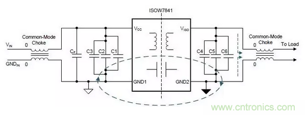 上圖是ISOW7841設計,使用扼流圈來降低共模電流以及返回路徑環路面積,間接減少輻射發射。 共模扼流圈可插入輸入和輸出電源或連接到系統的任何長電纜上。