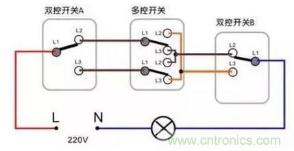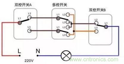 這里要新介紹一個開關(guān),叫做三控開關(guān)。開關(guān)布置的順序是,單開雙控→三控開關(guān)→單開雙控。先看個三控開關(guān)的圖,能更好理解,如下: