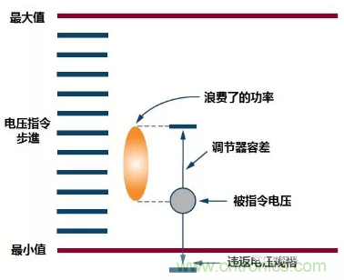 問題是大多數電源調節器都不夠準確。調節電壓可以在被指令電壓附近的公差范圍內的任何地方,并且它可以隨負載條件、溫度和老化而漂移。±2%容差的電源即表示可以在4%的電壓范圍內輸出任何值。為了補償電壓處于2%過低的可能性,被指令電壓必須比滿足時序所需的電壓提高2%。如果經過調節器后電壓漂移到高于被指令電壓2%處,它將比該工作點所需的最小電壓運行高4%。這仍然符合規定的FPGA所需的電壓要求,卻浪費了大量功率,如下圖2所示。