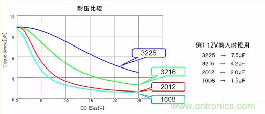 關于DC偏置,當然須選擇影響少的,不過即使電容值、耐壓相同,變動特性也會因封裝尺寸而異。下方圖表為其一例,顯示尺寸大者變動少。總之,請務必從電容器廠商取得充分的信息。