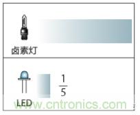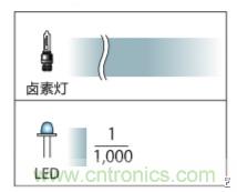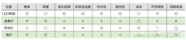 其中鹵素燈、熒光燈、氙燈都是我們常見的光源類型,鹵素燈又是這些里最常見的。那我們就看一下LED對比鹵素燈的: