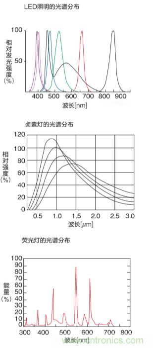 當然就算你的響應速度再快、消耗電流更小、壽命更長但如果光譜分布不好也是有問題的,所以下面我們看一下LED的顏色光譜分布情況。首先要說明LED照明的光譜分布不像熒光燈、鹵素燈那樣波長分布較寬,每個LED照明發光波長可謂某個固定的特定波長。