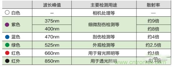 比紅光的散射率作為基準單位,各波長相對于紅光的散射率比值。波長越短散射率越高。使用散射率較高的波長時,便于捕獲檢測物體表面的散射光,有效檢測散射光反映出的表面特征。反之,波長變長時透光率也隨著增大,特別是紅外光照明,常用于背光光源檢測透過檢測物體的折射光。