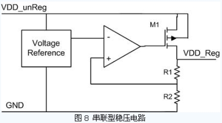 這種串聯型穩壓電路可以輸出較為準確的電源電壓,但是由于M1 管串聯在未穩壓電源與穩壓電源之間,在負載電流較大