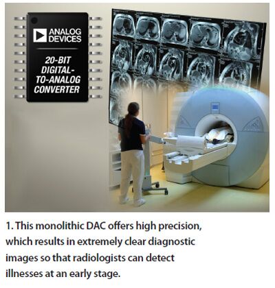 諸如MRI等成像設備的使用普及率在增加,目前全球每年要實施超過6千萬例MRI診斷。它們通常用于診斷阿爾茨海默氏癥(老年癡呆癥)、癌癥細胞和韌帶撕裂等各種疾病和損傷。成像系統采用了多種射頻/微波器件,包括振蕩器、發射器和天線。例如,ADI公司現在就提供一款為提高成像分辨率而設計的20位數據轉換器(DAC)AD5791。