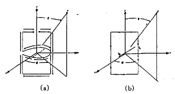 如圖2(a)所示。此處我們選擇螺旋中心為原點(diǎn),螺旋軸為Z軸,頂面和底面上天線臂的平行線為Y軸來(lái)建立坐標(biāo)系,另外柱面上的螺旋部分近似用直線和半圓的組合來(lái)代替,圖中的實(shí)箭頭表示電流方向,虛箭頭表示圓上電流的矢量和。顯然該模型可更進(jìn)一步簡(jiǎn)化為圖2(b)所示的一個(gè)YZ平面上的電流環(huán)和一個(gè)X軸上的電偶極子的組合。同樣跟它垂直的另一付雙臂螺旋天線亦可等效成一個(gè)XZ平面上的電流環(huán)和一個(gè)Y軸上的電偶極子的組合。根據(jù)天線的基本原理,由于這兩組電流環(huán)和電偶極子互相垂直且相差90°,那么在遠(yuǎn)區(qū)得到的是一個(gè)寬波束的心臟形圓極化方向圖。