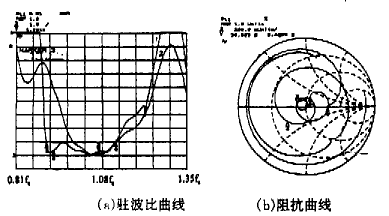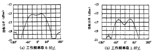 其中λC表示中心頻率對(duì)應(yīng)的波長(zhǎng)。最后得到該天線的實(shí)測(cè)結(jié)果如圖3、圖4所示。圖3(a)中的曲線1表示在HP8510B矢量網(wǎng)絡(luò)分析儀上測(cè)得的四臂螺旋天線的駐波比特性曲線,為了便于比較,在同樣條件下測(cè)得的八臂螺旋天線駐波比由曲線2給出,可見(jiàn)八臂螺旋能明顯地展寬天線的頻帶;圖3(b)表示在相同的儀器上測(cè)得的史密斯阻抗圓圖。此處我們根據(jù)要求將天線的頻帶設(shè)計(jì)在14%,而事實(shí)上可以做得更寬。圖4(a)和(b)分別為工作頻率取0.93fc和1.07fc(即圖3(a)中的標(biāo)記2和3)時(shí),由頻譜儀測(cè)出的遠(yuǎn)區(qū)輻射方向圖,它們的半功率寬度分別達(dá)到140°以及145°左右,這么寬的波束是其它形式的天線很難達(dá)到的。