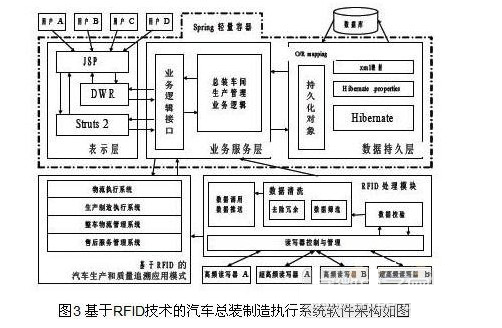 本系統采用B/S架構,在J2EE開發環境下,結合Struts2、Hibernate、Spring、DWR等主流開源框架,具有良好的跨平臺兼容性。基于RFID技術的汽車總裝管理系統的軟件架構如圖3所示: