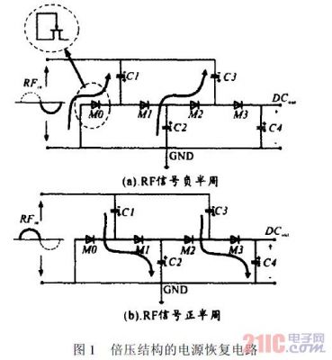 倍壓結構的電源恢復電路如圖1所示。圖中的二極管在實際應用時通常用MOS管替代。輸入正弦交流信號RFin=VAsint。在RFin負半周期時,M0導通,C1充電。C1兩端能夠獲得的最大電壓為VA-Vd,其中,Vd為MOS管M0兩端的電壓降。