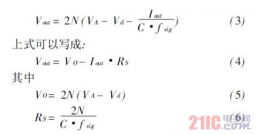 RFin正半周期時,節點1的最大電壓為VA+(VA-Vd)。該電壓使得M1導通,C2充電,直到C2兩端達到最大電壓,即節點2的最大電壓,為VA+(VA- Vd)-Vd=2(VA-Vd)。依次類推,C3兩端能夠獲得的最大電壓為3(VA-Vd),節點4的最大電壓為4(VA-Vd)。節點2N的最大電壓為 2N(VA-Vd)。于是,對于2N級電路,輸出直流電壓為:
