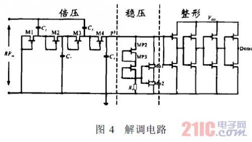 解調電路如圖4所示。M1~M4 為4級倍壓單元,起到檢波二極管的作用。由于并聯穩壓電路的瀉流管無法瞬間關斷,因此,在OOK信號關斷時刻,瀉流管抽取電容C4上的電荷。電容C4取值較小,因此,p1點電平迅速下降,形成較大的下脈沖凹陷,經過后級的整形電路,輸出標準的解調波形。