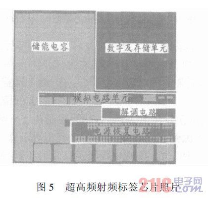 該射頻前端模塊作為超高頻長距離無源射頻標簽芯片的一部分,在UMC0.18m混合信號工藝下設計實現,并流片驗證。芯片照片如圖5所示。