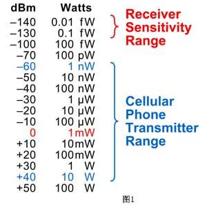 圖1給出了dBm的值及其相應(yīng)的瓦特?cái)?shù)其中還給出了移動(dòng)電話的發(fā)射機(jī)發(fā)射功率參考范圍以及靈敏接收機(jī)所能檢測到的最低信號(hào)功率[page]