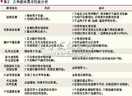 以上這些算法都是對主用戶發射端信號的直接檢測,基本都是從經典的信號檢測理論中移植過來的。此外,近期一些文獻從主用戶接收端的角度提出了本振泄露功率檢測和基于干擾溫度的檢測。有些文獻對經典算法進行了改進,如文獻[2]提出了一種基于能量檢測-循環特征檢測結合的兩級感知算法。文獻[3]研究了基于頻偏補償的匹配濾波器檢測、聯合前向和參數匹配的能量檢測、多分辨率頻譜檢測和基于小波變換頻譜檢測等。表2歸納了文獻中提及較多的一些感知算法,并對其優缺點進行了比較。