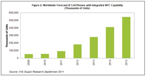 據IHS iSuppli公司的移動與無線通信研究報告,由于市場對移動電子支付和其它應用的需求旺盛,2015年采用近距離通信(NFC)技術的手機出貨量將是是2010年5620萬部的10倍,達到5.447億部。