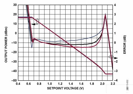圖2:ADL5330輸出功率與AD8318設(shè)定點(diǎn)電壓關(guān)系曲線,PIN = -1.5 dBm