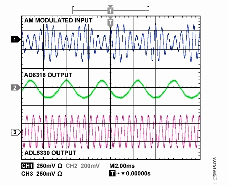 為使AGC環(huán)路保持均衡,AD8318必須跟蹤ADL5330輸出信號(hào)的包絡(luò),并向ADL5330的增益控制輸入提供必要的電平。圖3所示為圖1中 AGC環(huán)路的示波器屏幕截圖。將采用50% AM調(diào)制的100 MHz正弦波施加于ADL5330。ADL5330的輸出信號(hào)為恒定的包絡(luò)正弦波,其振幅與AD8318的設(shè)定點(diǎn)電壓1.5 V相對(duì)應(yīng)。圖中還顯示了AD8318對(duì)不斷變化的輸入包絡(luò)的增益控制響應(yīng)。