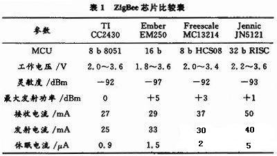ZigBee技術是一種近距離、低功耗、低數據速率、低復雜度的雙向無線通信技術,適用于無線傳感器網絡。目前,多家公司均有自己的主流ZigBee芯片,如表1所示。經綜合比較,該設計選用CC2430芯片,該芯片是Chipcon公司提供的全球首款支持ZigBee協議的SoC解決方案,它在單個芯片上整合了ZigBee射頻前端、內存和微控制器,最大27 mA的工作流耗及在休眠模式下0.9μA的流耗使之非常適合無線傳感節點對低功耗的要求。