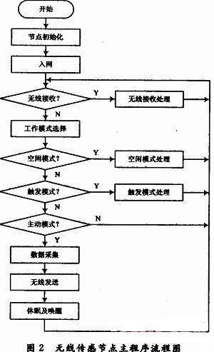 節點程序主流程如圖2所示,主要包括數據采集和無線通信兩個部分。出于傳感節點低功耗的考慮,軟件設計重點放在工作模式的處理上。
