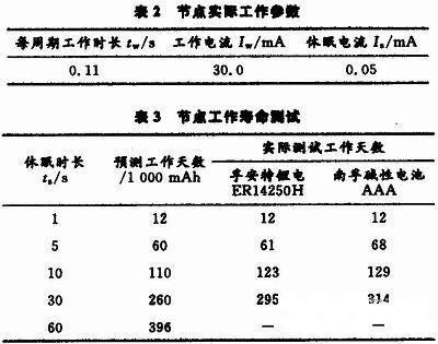 通過測試獲取節點工作參數如表2所示,工作電壓為3.3 V。可知,節點工作時流耗大,在休眠狀態則小得多。因此,為保證在供電電量有限的情況下獲得更長的工作壽命,有必要將節點設置為間歇式工作模式,即工作休眠周期性交替進行。下式為節點壽命預測公式: