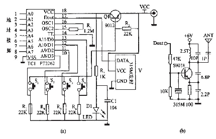 該部分電路主要由315MHz無線數據發射模塊和編碼集成PT2262組成。該無線發射模塊原理圖如圖1中(b)所示,它具有較寬的工作電壓范圍3-12V,當電壓變化時發射頻率基本不變,和發射模塊配套的接收模塊無需任何調整就能穩定地接收。當發射電壓為3V時,空曠地傳輸距離約20-50m,發射功率較小;當電壓5V時約100-200m)當電壓9V時約300-500m;當發射電壓為12V時,為最佳工作電壓,具有較好的發射效果,發射電流約60毫安,空曠地傳輸距離700-800m,發射功率約500mW.當電壓大于12V時功耗增大,有效發射功率不再明顯提高。發射模塊采用ASK方式調制,以降低功耗。當數據信號停止時發射電流降為零,數據信號與DF發射模塊輸入端可以用電阻或者直接連接而不能用電容耦合,否則DF發射模塊將不能正常工作。數據電平應接近DF數據模塊的實際工作電壓,以獲得較高的調制效果。