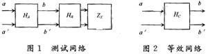 圖1中網(wǎng)絡(luò)HA,HB,ZX組成測試網(wǎng)絡(luò),圖2中HC為其等效網(wǎng)絡(luò)。HA,HB為無源線性雙口網(wǎng)絡(luò),起著匹配、隔離和濾波的作用,使得在bb′處能觀測到比較好的正弦波。HC的傳輸函數(shù)可以表示為: