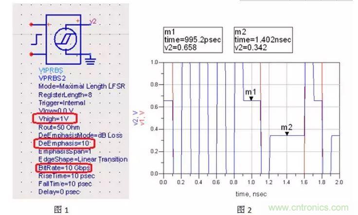 圖2中藍色信號是驅動端速率為10Gbps(基頻為5GHz),輸出幅值為1V,去加重為10db時的輸出波形,紅色為去加重為0時的輸出波形。