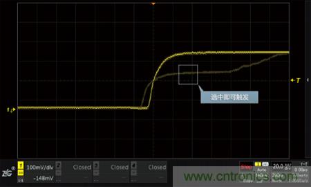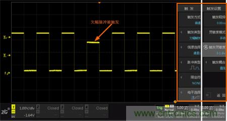 如下圖所示,設置了欠幅觸發(fā)及普通觸發(fā)后,欠幅脈沖信號被觸發(fā),穩(wěn)定的顯示在屏幕上。