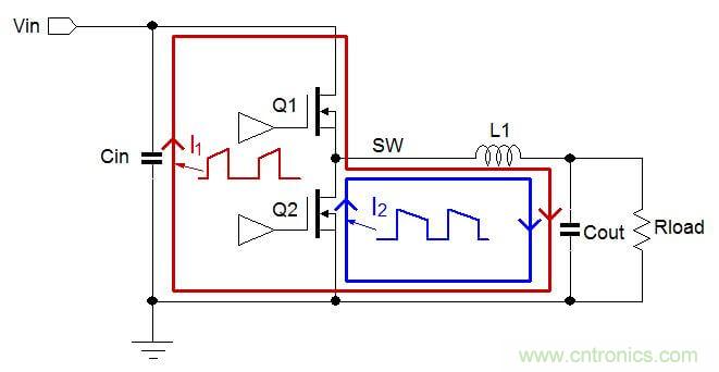 Buck架構DC/DC轉換器中存在兩個電流發生劇烈變化的主回路 :