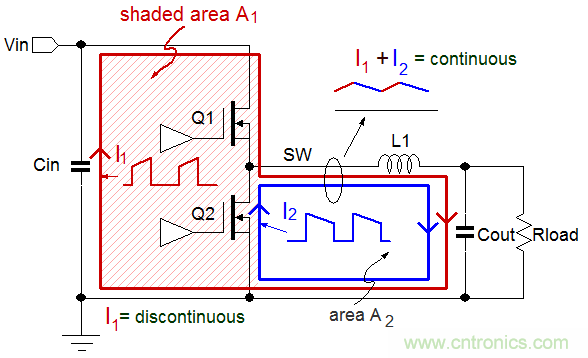 當上橋MOSFET Q1導通的時候,電流從電源流出,經Q1和L1后進入輸出電容和負載,再經地線回流至電源輸入端。在此過程中,電流中的交變成分會流過輸入電容和輸出電容。這里所說的電流路徑如圖2中的紅線所示,它被標注為I1。