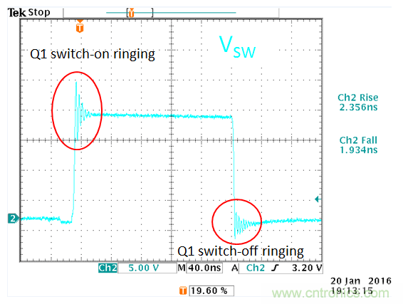 從實驗結果來看,開關切換波形上的過沖實際上已經消失了,但還存在低頻的振鈴信號。