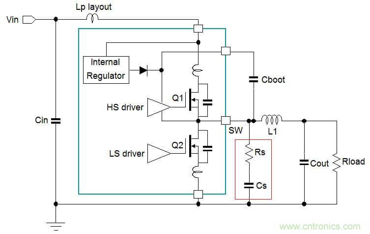這些寄生電容是由MOSFET的Coss和相對于基底之間的電容共同構成的,另外還有寄生電感存在于從IC引腳到晶圓內核之間的連接線上,這些寄生元件和PCB布局所導致的寄生電感與輸入濾波電容上的ESL一起將導致開關切換波形上的高頻振鈴信號。當MOSFET Q1導通時,開關節點信號上升沿的振鈴信號主要就由Q2的Coss和MOFET開關切換路徑上的總寄生電感(LpVIN + LpGND+ LpLAYOUT + ESLCIN)導致。當MOFET Q1截止時,開關節點信號下降沿的振鈴信號主要由Q1的Coss和下橋MOSFET源極到地之間的寄生電感(LpGND)導致。