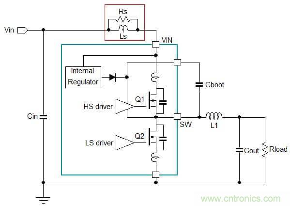 在理想狀況下,輸入、輸出電容對于Buck轉換器的開關電流來說都具有極低的阻抗。但在實際上,電容都存在ESR和ESL,它們都增加了電容的阻抗,并且導致上面出現額外的高頻電壓跌落。這種電壓跌落將在電源供應線路上和負載連接電路上形成相應的電流變化,見圖4。