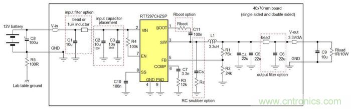 本章將示范在Buck轉換器的EMI設計中的不同方法所導致的影響。示范所使用的IC是RT7297CHZSP,一款800kHz工作頻率、3A輸出能力的電流模式Buck轉換器,采用PSOP-8封裝。測試中的電路工作在12V輸入下,輸出為3.3V/3A,測試所用電路顯示在圖12中。